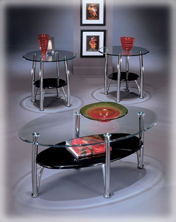 The subtle curve of the chrome color legs and clear beveled glass table top come together to create the contemporary style of the Dempsey accent table collection. The welded metal construction supports a polished black polyurethane finished shelf to further add to the contemporary atmosphere. Brighten up your home with the clean look of the Dempsey accent table collection.