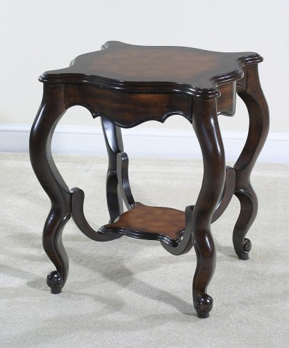 A beautiful decorative end table featuring serpentine shaped sides and legs. Features: Traditional style Painted walnut finish wood top The French influenced design is perfect as an accent table in any room of the house. Plant shelf base. Square shape