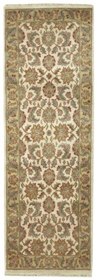 New Handmade Knotted Indian Jaipur 2'6 x 7'6 Runner Area Rug from India with Wool pile. Indian designs were strongly influenced by those of Iran, mainly by the curvilinear styles such as Esfahan. Popular designs of the 18th and 19th century, which Indo-mir is still a remaining example of, were mainly in the all-over layout with very small floral motifs such as plants, palmettes, rosettes and leaves. Often the same motif was repeated through the entire rug. Borders were very similar to the motifs in the field. There was not much color contrast in the rugs; the colors were mostly well coordinated to suit the Western taste. Brownish red was the dominant color. In addition to this color, light and dark green and burnt orange were also popular. Indian rugs missed the period of Aniline dyes which faded rapidly with exposure to light and water. Colorfast Chrome dyes directly replaced natural dyes.