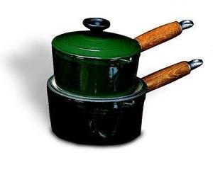 SPECS: Dia. 7 1/8" x H 5 1/2" 2 Qts. Blue - Description: This product has a wooden handle that stays cool even under the highest temperatures. It comes with a lid with an easy grip knob and has a small spout on the lip for easy pouring or straining. Available in four colors: blue, green, red, & yellow.