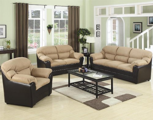 Enjoy the comfort and style of this casual two tone microfiber sofa group. Covered in an ultra plush microfiber with a dark brown vinyl base. Pillow padded arms and double tiered seat back provide comfort and support. Includes sofa, loveseat, and chair.
