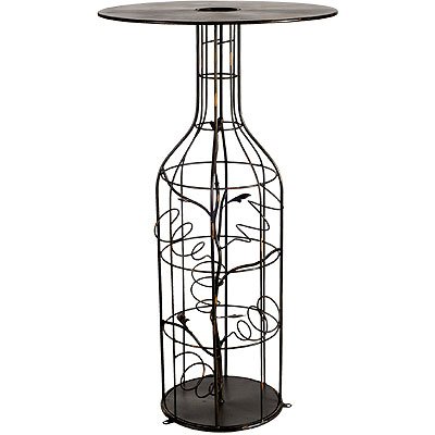 Relax in style with our metal round pub table. Table base is gorgeous ornate metal with a wine rack in a wine bottle shape. Holds 5 bottles of wine for easy access and 2 glass racks holding wine glasses (underneath of the table top). Made of wrought iron. Measures D23"x41".