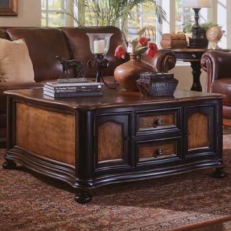 Authorized Hooker Furniture Dealer for 864-80-109 Coffee Tables. The Preston Ridge collection brings you this lovely collection of living room tables, each with plenty of storage options and careful attention to detail. This cocktail table brings all the storage options of a larger piece to the center of the room. With 4 storage drawers and 4 side cabinets, there is plenty of space for all your storage needs and the beautifully finished table top is simply the cherry on top. Features: Transitional style Bun feet Constructed of hardwood solids and cherry veneers 4 storage drawers 4 side cabinets Wood base Black rub-through finish with physical distressing Specifications: Dimensions: 20.5inH x 42inW x 42inD Weight: 231 lbs.The Table Top Material is Wood Top.The Base Material is Wood.The Style is Transitional.The Features is Drawers.The Features is Storage.The Assembly is Assembled.