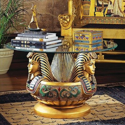Three Heads of Tutankhamen Sculptural Glass Topped Table in Faux Gold Review