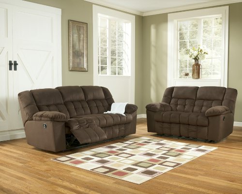 The comfortable contemporary design of the Lowell Chocolate Reclining Living Room Set by Signature Design by Ashley comes to life with the warm earth tones of the upholstery fabric stylishly surrounding the plush padded arms and supportive stitched back creating the comfort and style perfect for any living room décor.