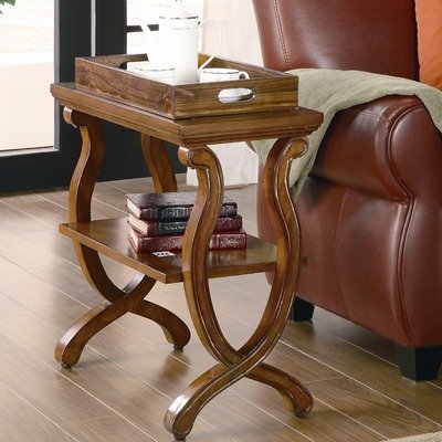 This elegant side table is the perfect addition to your accent chair or recliner. Features a storage tray top and middle storage shelf. Finished in a warm brown.