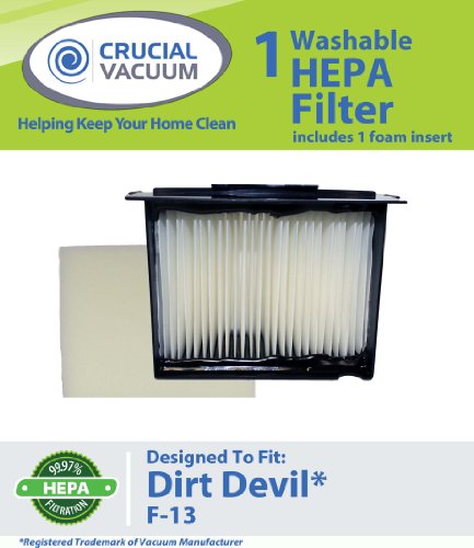 1 Dirt Devil F13 (F-13) Washable HEPA Filter Plus Foam Fits Reaction Dual Cyclonic, Reaction All-Surface, Reaction Fresh, and Action Vacuum Cleaners: Compare to Dirt Devil F-13 Filter Part # 3LK0540001; Designed & Engineered By Crucial Vacuum Feature