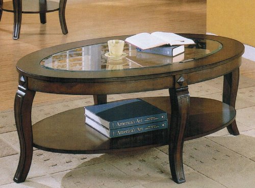 The Riley Coffee Table with Glass Top and Shelf in Walnut Finish by Acme Furniture features beveled glass inlaid top and a bottom storage shelf. Embellish your room with the classic beauty of this item. Dimensions: 50W x 30D x 18H Matching end table is available separately. Assembly required.